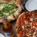 Una bianca con rucola, una rossa con funghi e pepperoni… e una birra ghiacciata che aspetta solo di essere stappata.
